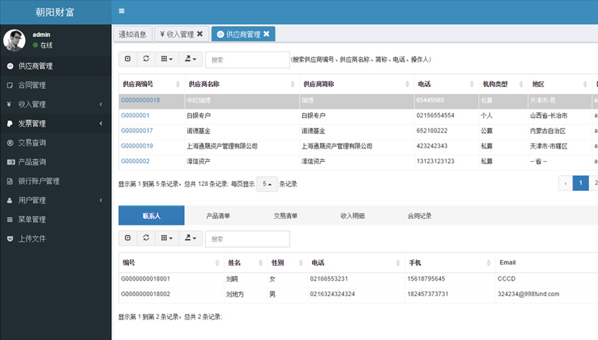 - 供應(yīng)商管理: 供應(yīng)商信息管理,包括交易、收入、聯(lián)系人、產(chǎn)品等